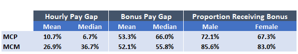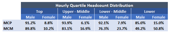 The data represents the average and median pay of all female and male employees within MCP and MCM, respectively. The UK Gender Pay Gap data is calculated in a manner that reflects the difference in average pay between men and women, without taking into account the nature of the firm’s UK-based employees’ roles, seniority or performance. The Gender Pay Gap data does not reflect equal pay, which addresses the differences between men and women in the same roles carrying out equal work. Our reward practices are reviewed to focus on compensating our people fairly for the same roles.